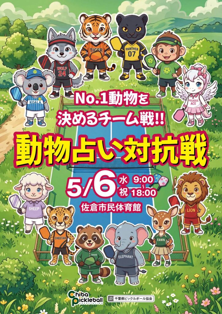 | 大会方式 | 【チーム編成】 「動物占いタイプ」ごとにランダムで振り分けます。人数に満たない場合は、混合チームとなります。 同じ動物で複数チームが編成される場合があります(例:トラA・トラBなど)。各動物には、ライバル動物を設定します。 【競技方法】 同じ動物同士で毎回ランダムでペアを変更して予選試合を3~4試合実施。予選の総合平均ポイント上位8タイプの動物で、個人平均ポイント上位者から4〜6名選出して団体戦をダブルイリミネーション方式トーナメントで実施。 【試合方式】 予選:各試合の結果を個人ポイントと動物タイプへポイントを反映。(勝利:2ポイント、引き分け:1ポイント、敗戦:0ポイント) ・1ゲーム9点先取 ・どちらかの得点が5点になった時点でエンドチェンジ(任意) ・女性/小学生1名につき2点ハンデ ・ライバル動物に勝った場合、動物タイプへ+1ボーナスポイント 決勝:1対戦ダブルス3試合。 ・1ゲーム9点先取 ・どちらかの得点が5点になった時点でエンドチェンジ(任意) ・1対戦のうち同じペアの出場は不可 ・女性/小学生1名につき2点ハンデ 【審判方式】 ・いずれの試合においてもセルフジャッジ 【リーグ戦勝敗決定基準】 ①平均ポイントで決定②平均得失点差で決定③総得点で決定とする | ||